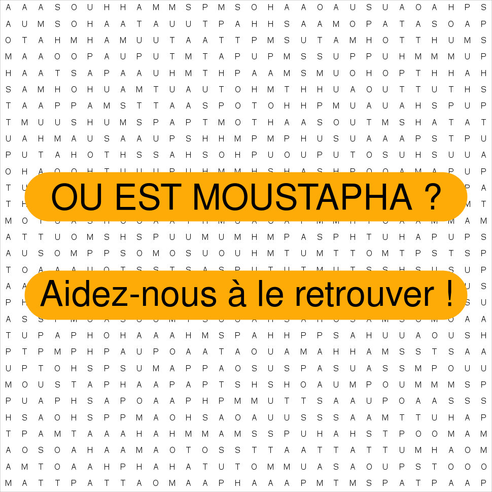 La grille de jeu "Où est MOUSTAPHA ?" générée sur MotPerdu.fr est mise à disposition selon les termes de la licence Creative Commons Attribution 4.0 International.